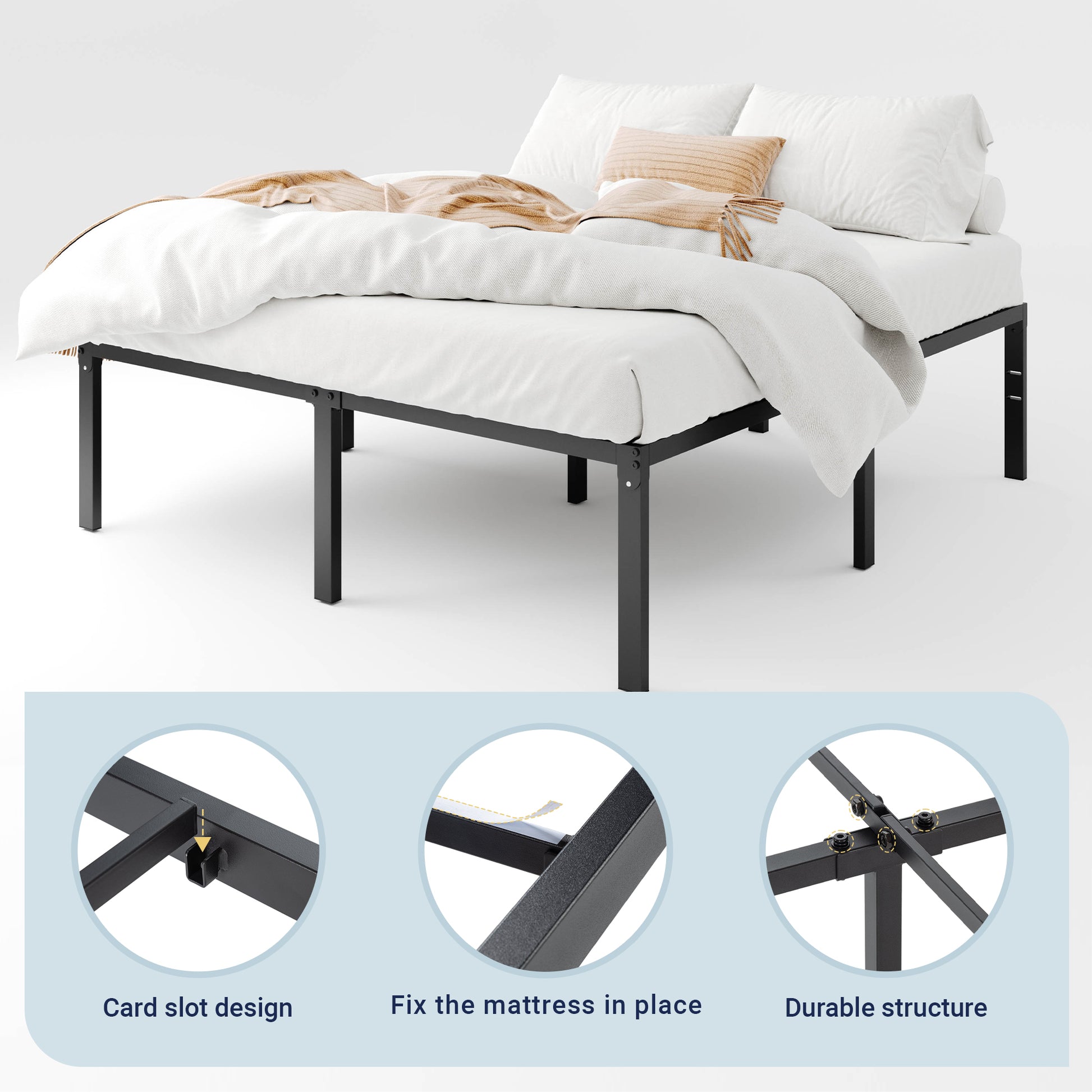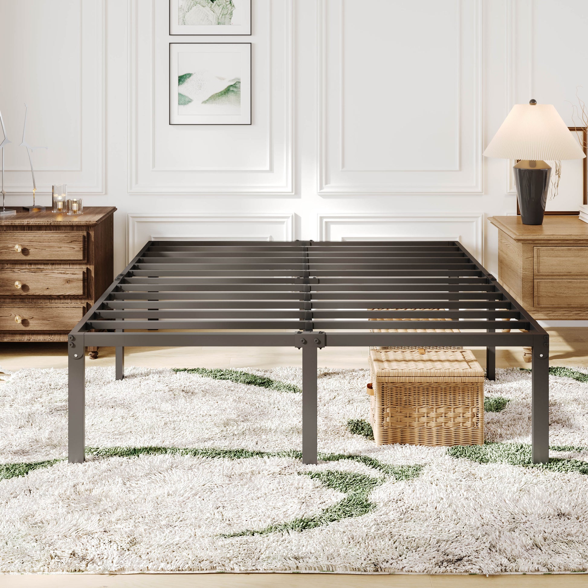 Maximize space and style with our sleek Metal Platform Bed Frame, designed for modern living. Featuring a generous 16.5'' under-bed storage area, effortlessly tuck away bins, seasonal items, or extra bedding. Its foldable metal legs ensure quick, tool-free assembly and portability, while the heavy-duty steel construction guarantees lasting stability for years of comfort. Perfect for small spaces or minimalist aesthetics, this bed frame combines smart storage solutions with a clean, industrial-inspired design. Durable, versatile, and effortlessly functional—upgrade your bedroom with a foundation that prioritizes practicality and style.