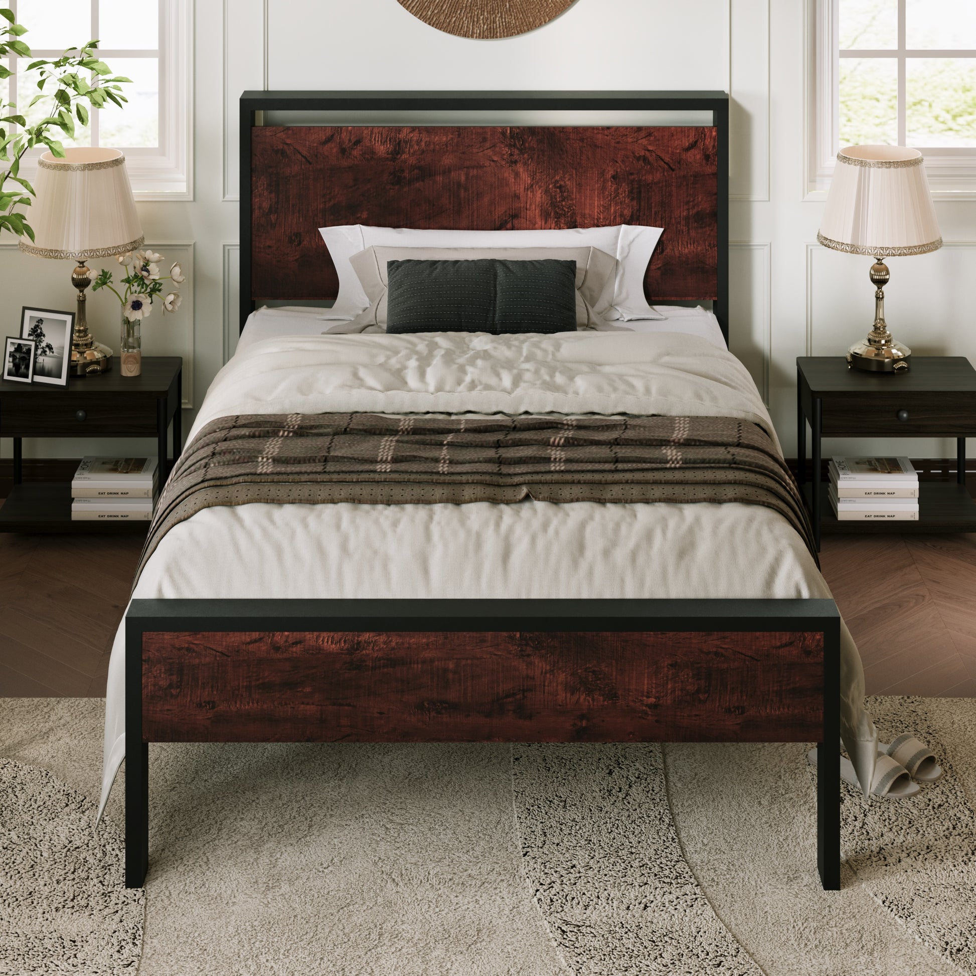- Unique Design: The combination of rustic style headboard and footboard and retro frosted metal slats gives a strong industrial / rustic flair, enriching your room with industrial and unique individualism. The wood headboard consists of a Waterproof & Scratchproof wood board.