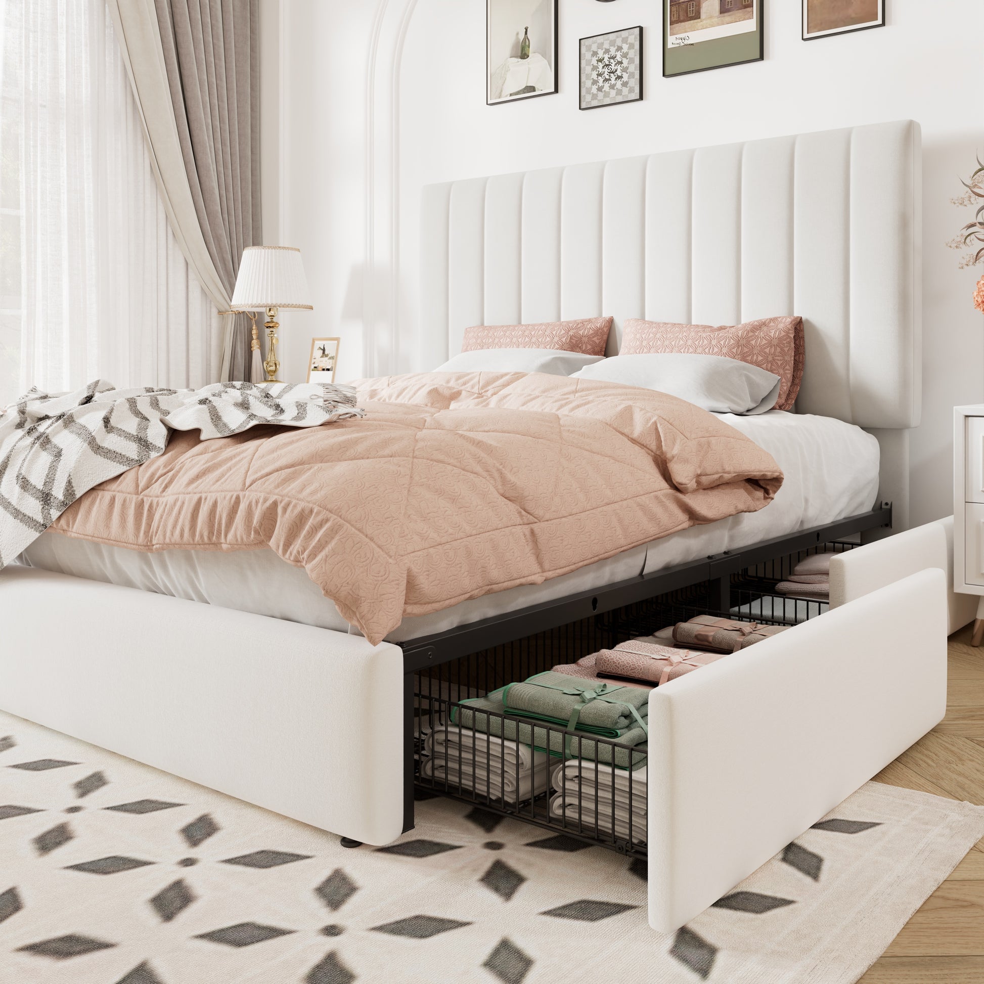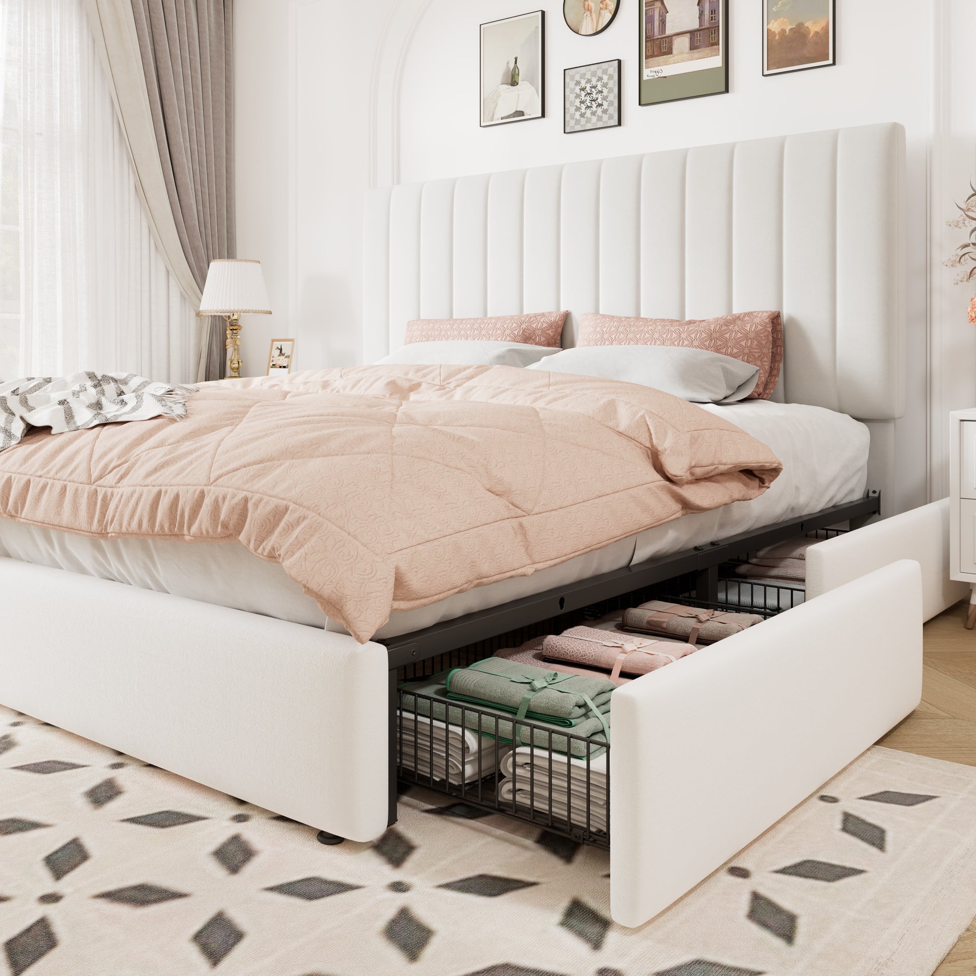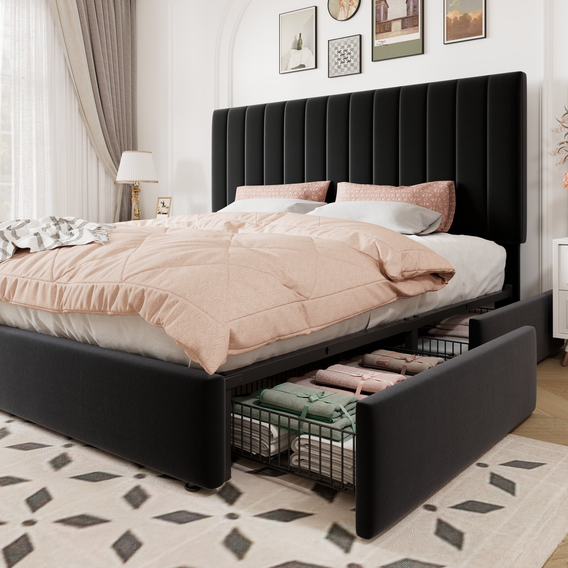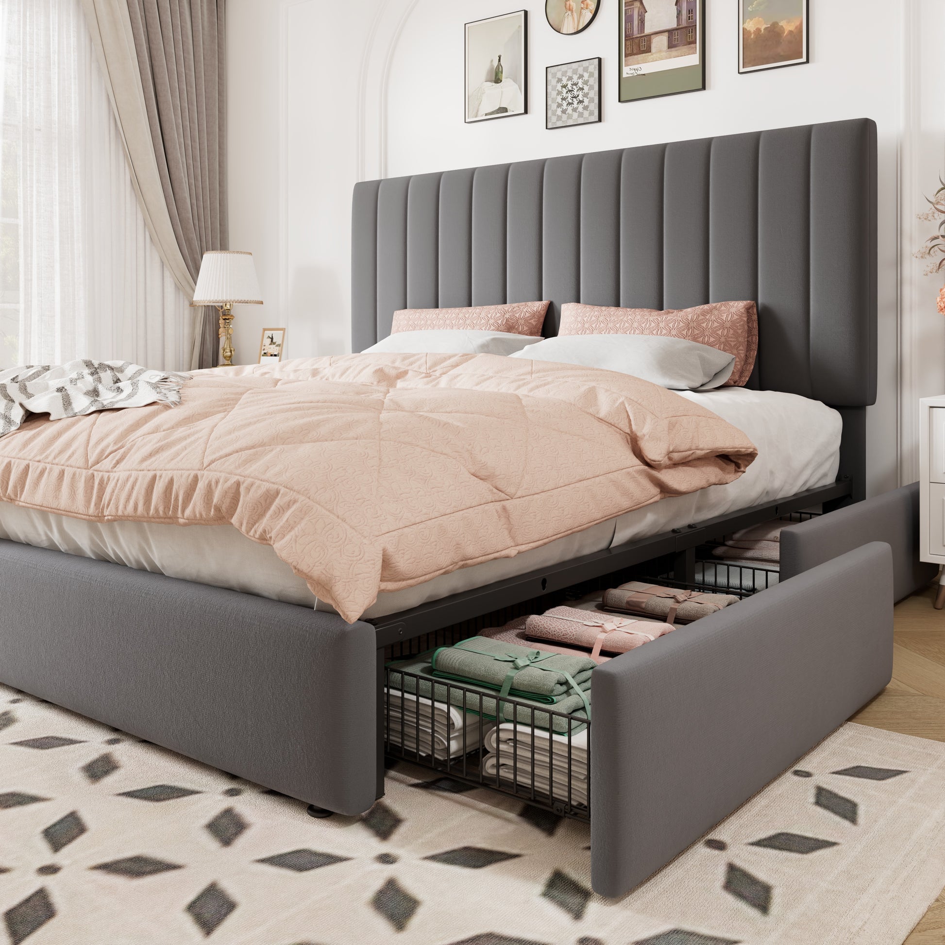 - 4 Oversized Drawers:The upholstered king bed frame comes with four spacious storage drawers underneath, providing ample space for bed sheets, accessories and off-season clothing. Each drawer has four smooth wheels that make them easy to pull in and out